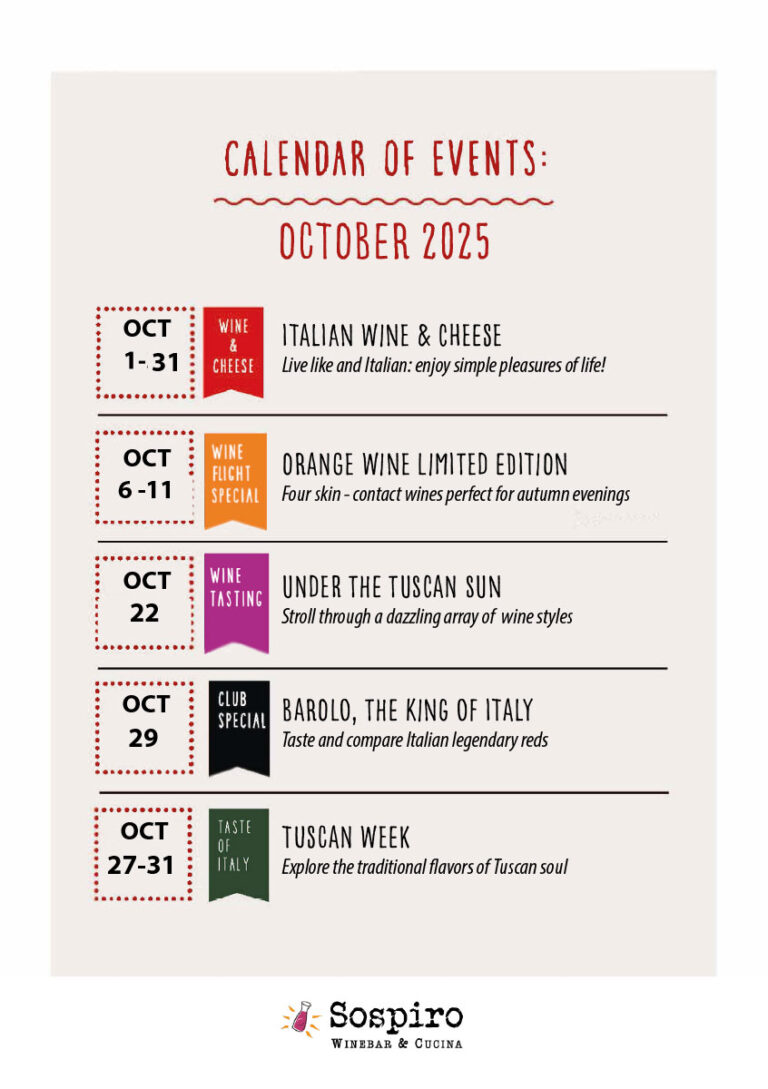 Please check back often for upcoming dates or contact Fabrizio via email at fabrizio@sospirowinebar.com